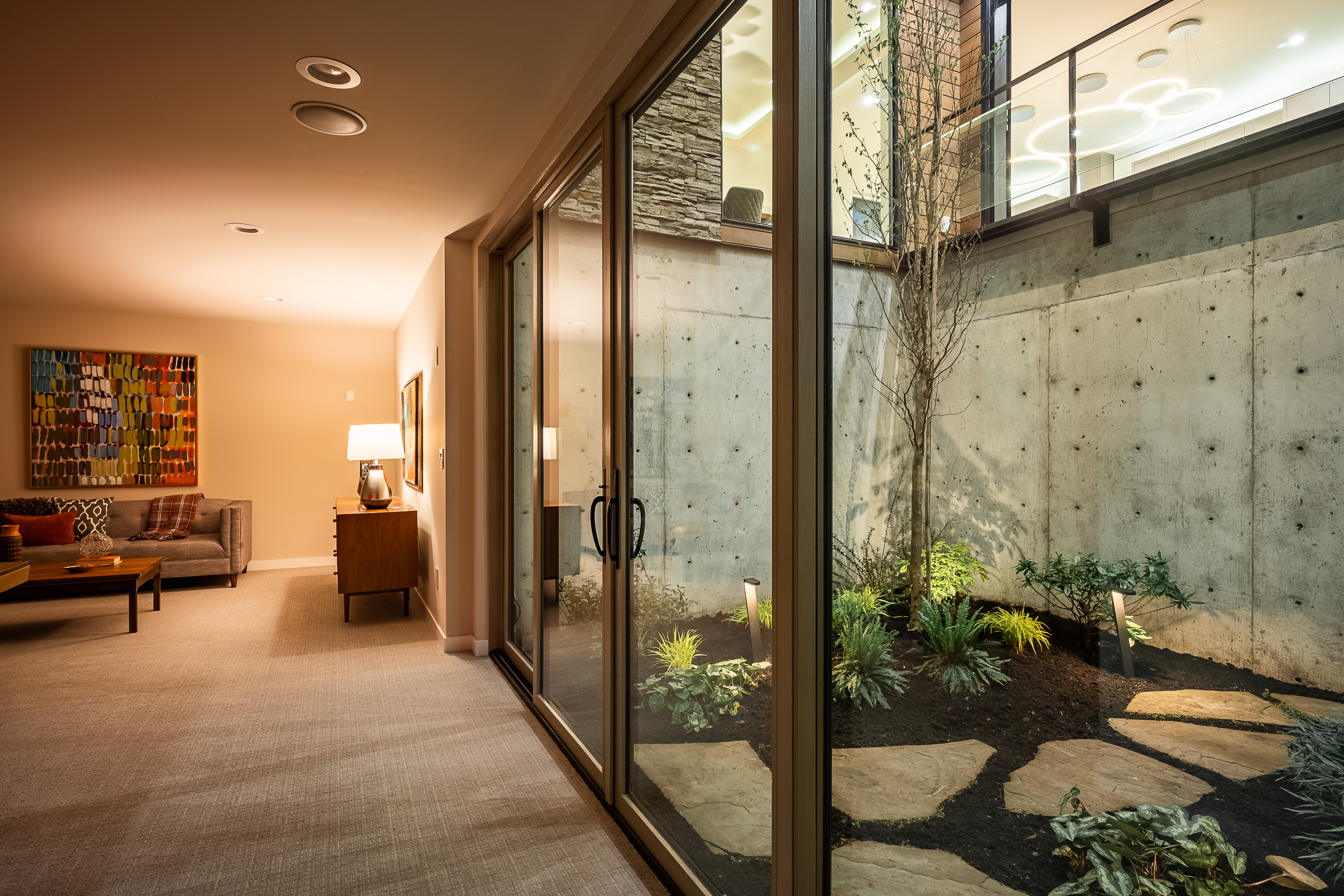 The main living spaces, kitchen, and dining room are at street level, organized around the atrium. Bedrooms are on the upper level. Below, an entertainment room opens directly to the atrium, giving even the basement a connection to daylight and sky.