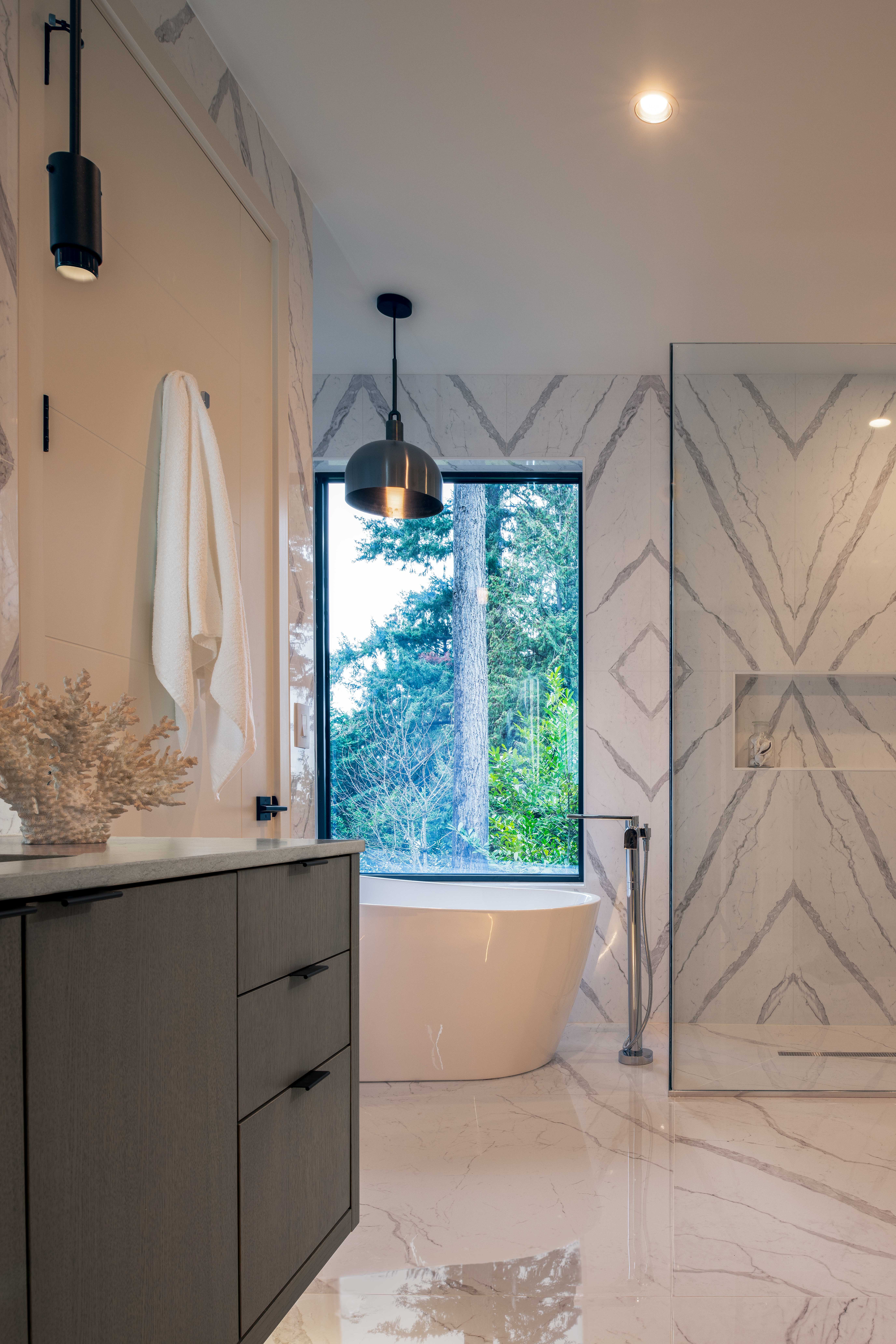 Along the east façade, tall windows frame the sky and the surrounding Douglas firs and ponderosa pines. The vertical rhythm of the exterior cladding echoes the trees on the site and in the neighborhood. On the street-facing side yard, darker materials and articulated volumes break down the scale of the house, allowing it to sit quietly on the corner despite its size.