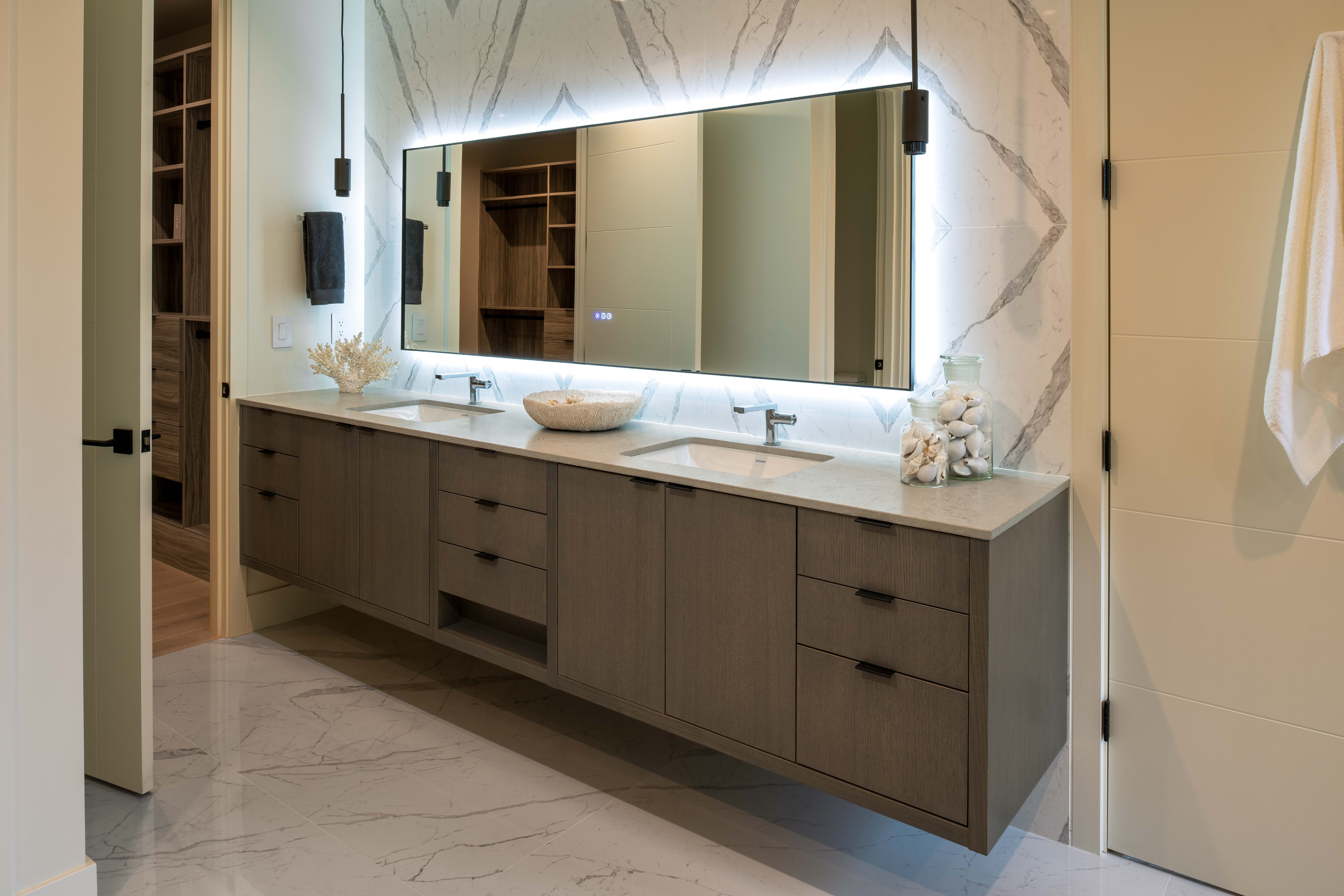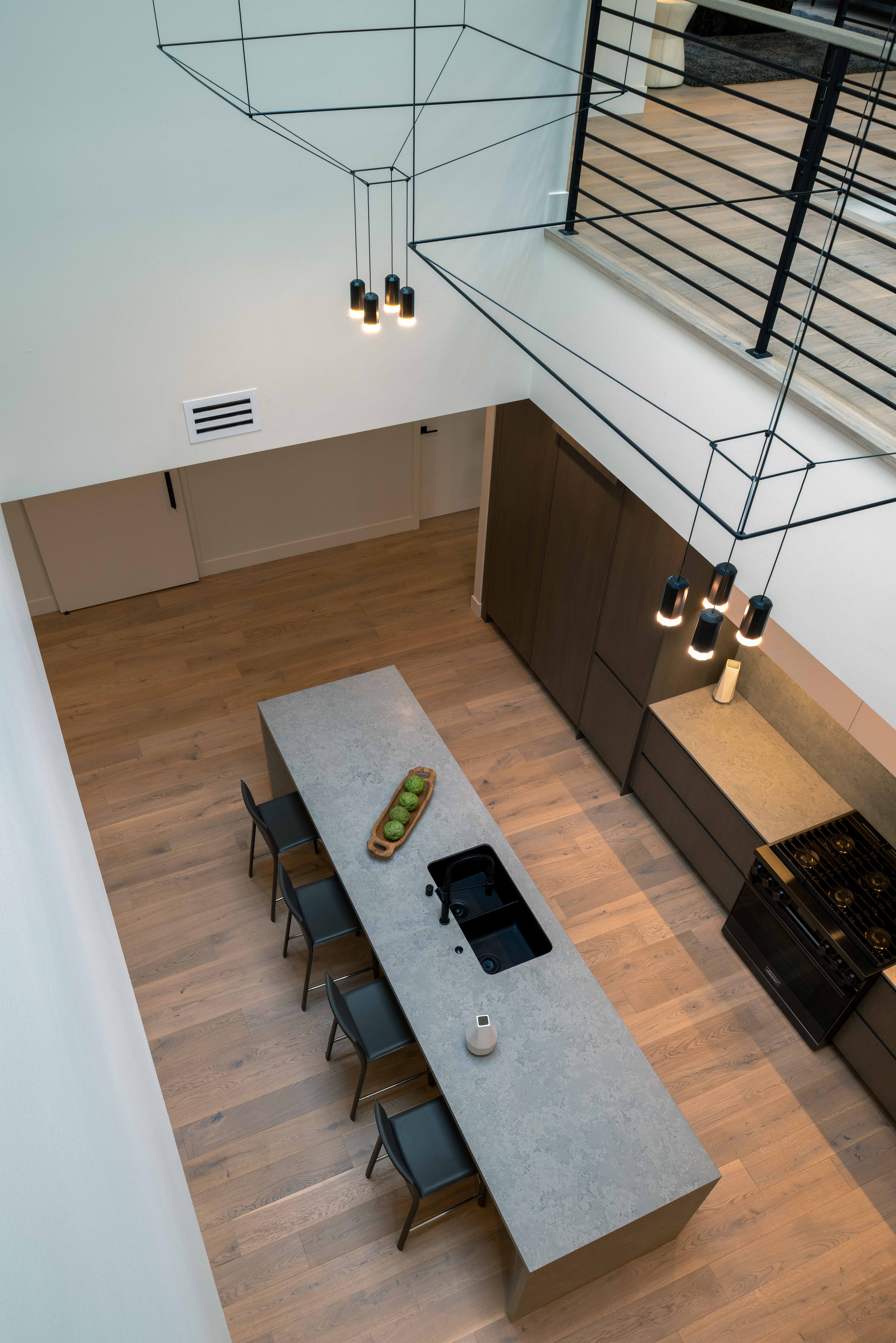 This modern 5,200-square-foot home in Clyde Hill is designed to take full advantage of a corner lot. The massing is carved back at the southwest to create a generous backyard, while two double-height spaces above the entry and kitchen bring daylight deep into the home through a series of strategically placed skylights.