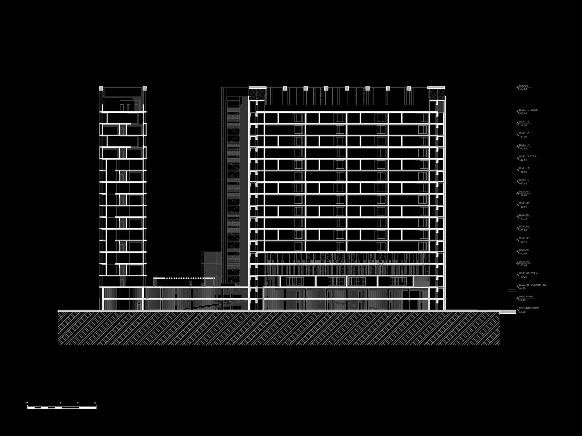 The brief had strict requirements for visual privacy and this determined the layout of the towers of the site - as well as their maximum footprint: the buildings are placed to avoid direct views into other units. The structural layout is free and independent from the location of the unit demising walls - providing maximum flexibility for implementing the desired unit mix, without affecting the structural grid. A floating brise-soleil provide protection from the sun.